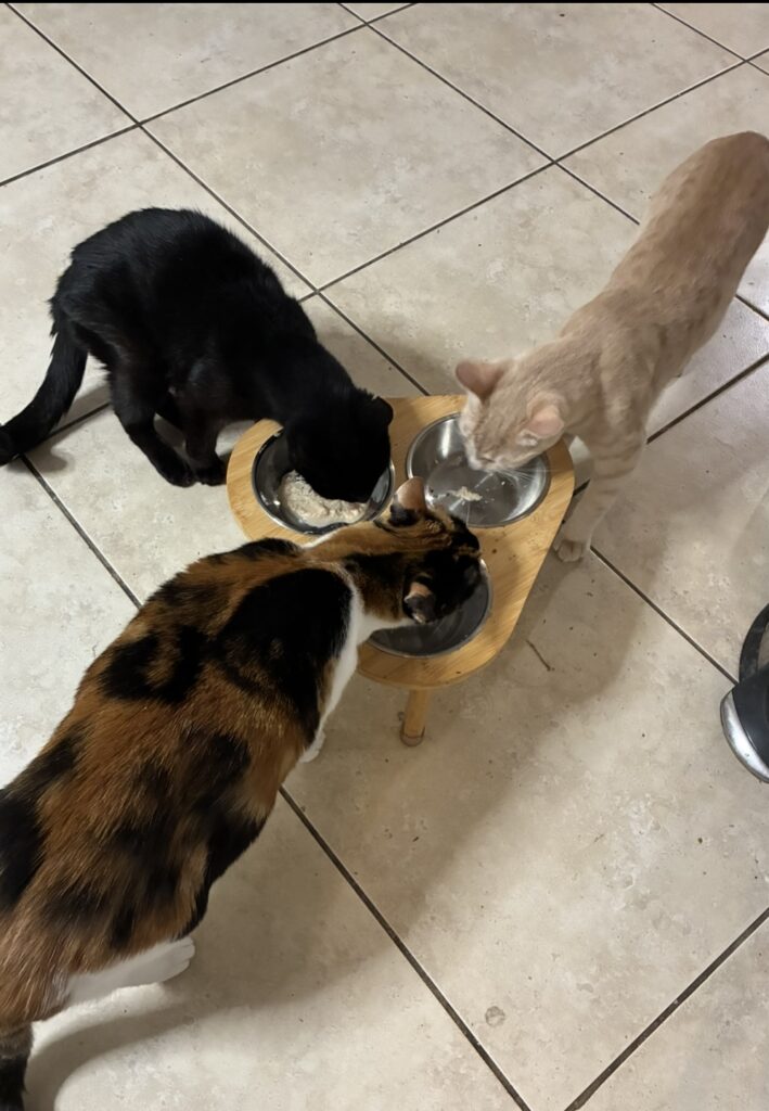 1. The cats are okay AS LONG AS THEY ALL HAVE FOOD. If one of them finishes first, that one tries to hog the other’s food. I took that photo because it was a wonderful moment of peace.