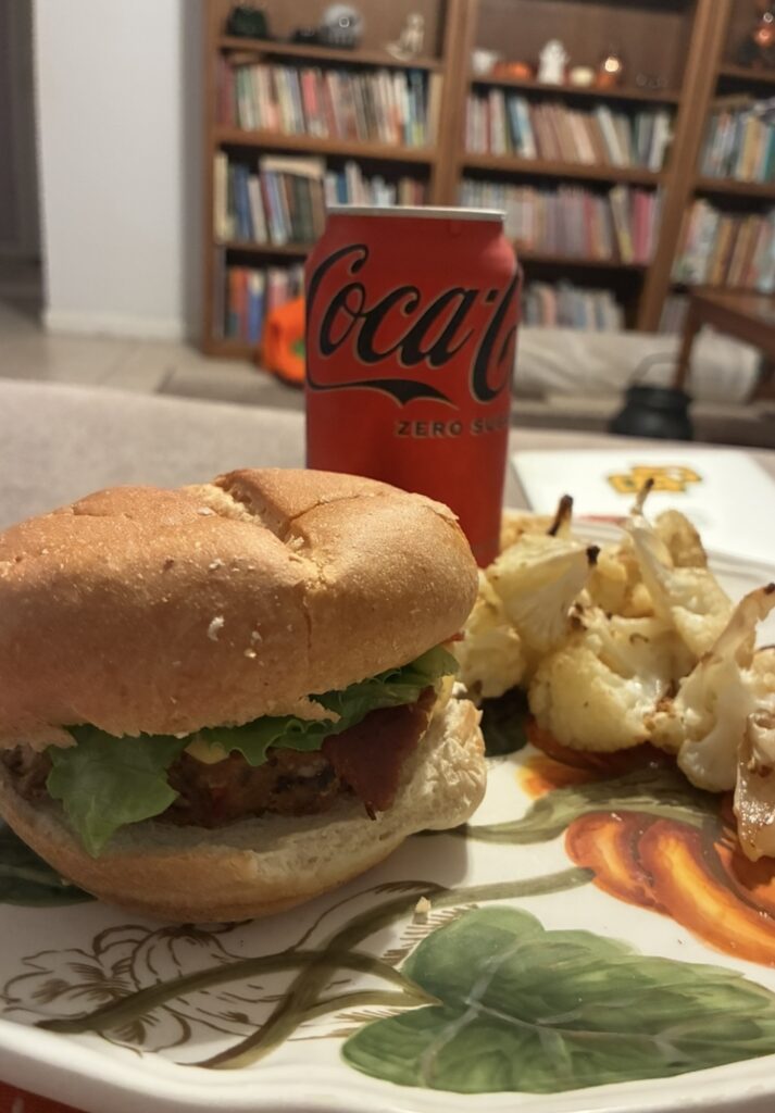 Later in the afternoon I had to drive my daughter to the gym, clean up from lunch, and do a load of laundry. Then, dinner! I used the leftovers to make myself a veggie bacon cheeseburger (NOT with the parmesan!)