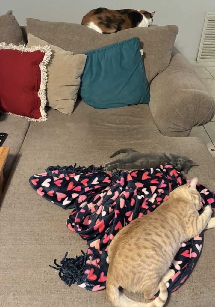 THE CATS. Muffin is doing so well. Here she is… so close to cuddling on the couch with Foxy and Sylvie.