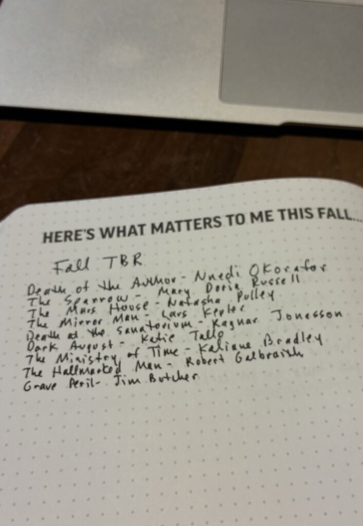 One thing that DID work was my “Summer TBR.” I read almost every book on it, with the exception of The Ministry of Time (migrated to my fall list) and How to Read a Book, which I changed my mind and decided not to read after all. These are by no means the ONLY books I’ll read this fall… it’s just a list of books I’m interested in and want to prioritize.