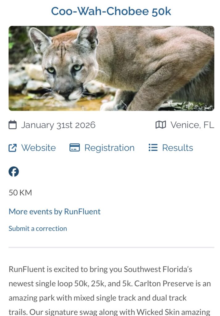 I’m not sure I like the photo- is this supposed to convince me to run this race? Am I going to be attacked by a panther??? But it fits in with my schedule. Having tentatively picked this race, I can organize my running more, and figure out where I want to be with my long runs each month.