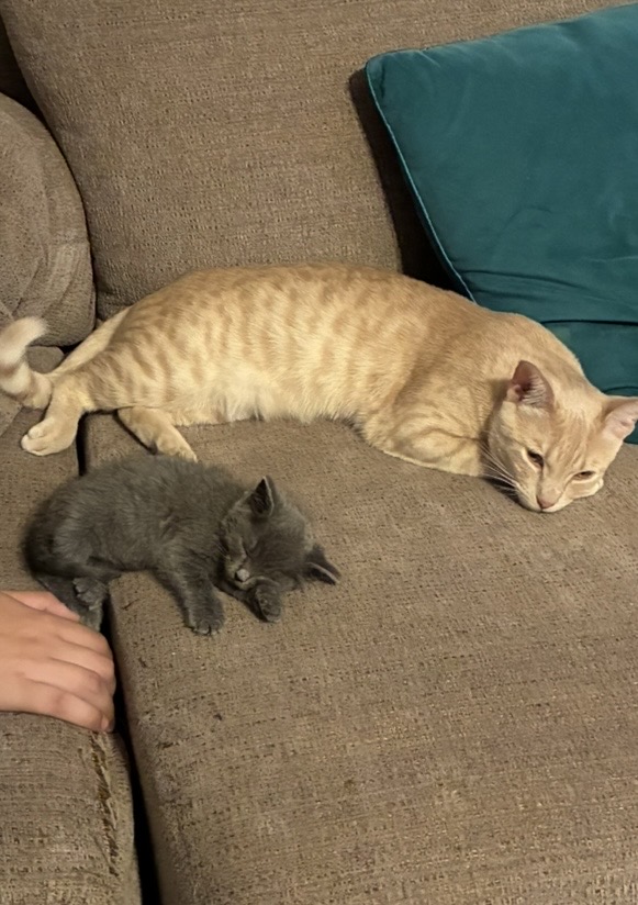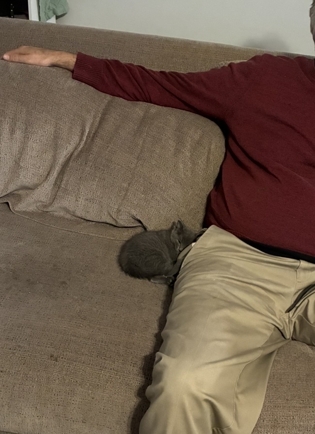 Evie!!! She’s bonded with Foxy and getting cuddle time with your husband, so I’d say it’s about 24 hours away from becoming official.