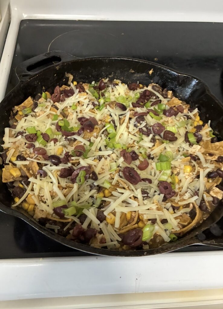 We will now be putting olives on everything! Like, I made this recipe from Nora Cooks for skillet enchiladas.