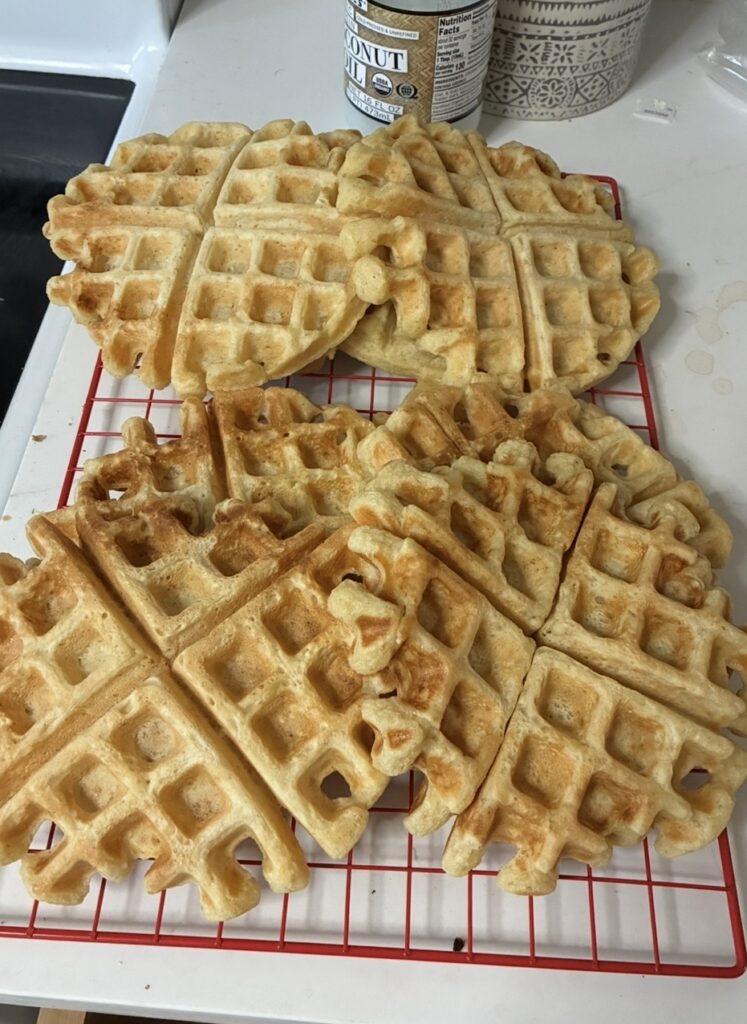 … and waffles. My son requested them for breakfast, and it’s easier to pull them out of the freezer than to get out the waffle maker in the morning. Recipe also from Nora.