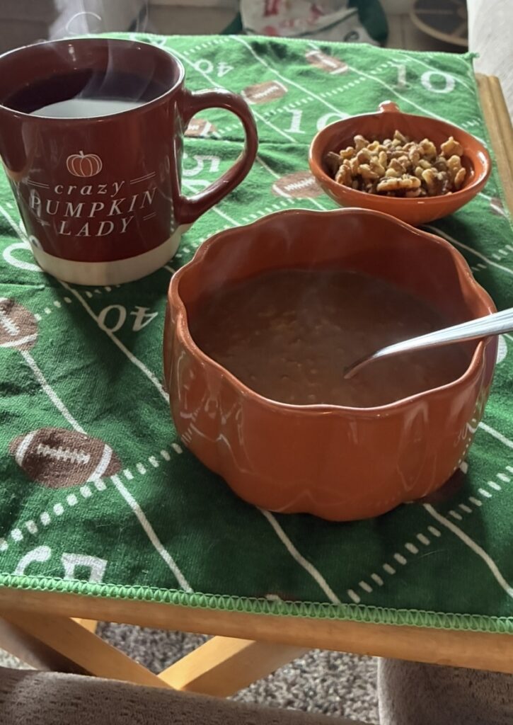 The last thing I would share over coffee is, I’ve added oatmeal back to my diet! My stomach is doing well with it. Here’s the first pumpkin oatmeal of the season: