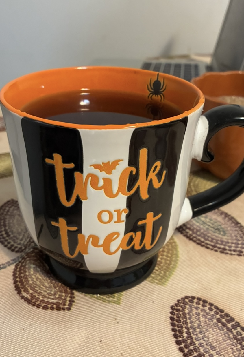 I have very few decorations up, but it still feels slightly festive. I am a minimalist to begin with AND I don’t really like Halloween. So I mostly lean into fall themes: I have a little wooden leaf swag on my mantle (from the Dollar Store!), and a few thrifted items. Maybe 8 things up total??