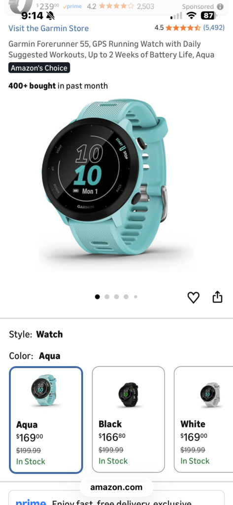 Speaking of colors… I need a new Garmin. My old one works well, but the battery life is not good enough to see me through my race this month. The one I’m looking at has three different options for the band- black, white, or aqua.