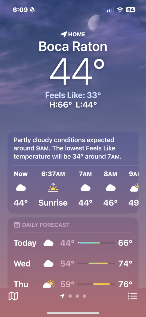 15. Wow, 44* with a “Feels like” 33! That is way colder than we ever get here. I’m surprised it gets down that low in Florida! I’m glad you got in so many good runs this week, even though stuff felt off a bit. I notice you never take rest days, at least not from both running and strength training. Has that always been the case? For how many years?